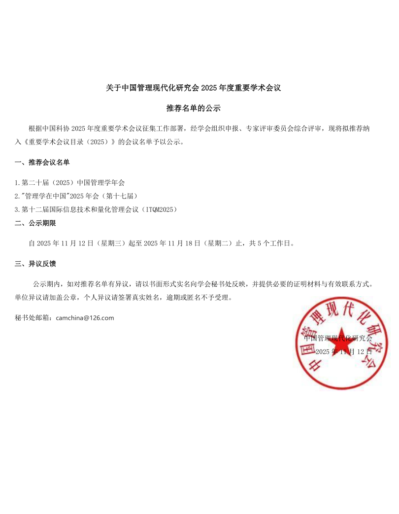 关于中国管理现代化研究会2025年度重要学术会议推荐名单的公示